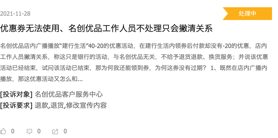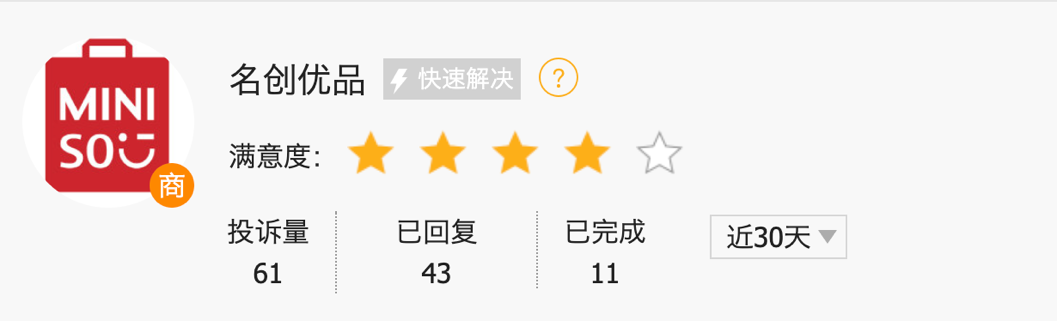 然而,谋划“社群朋友圈视频好”全面攻势,开启“恋爱模式”的名创优品近30天处理消费投诉的状况却不怎么理想。以黑猫投诉为例,名创优品近30天的投诉量为61条,其中只有43条已回复,11条显示已完成。